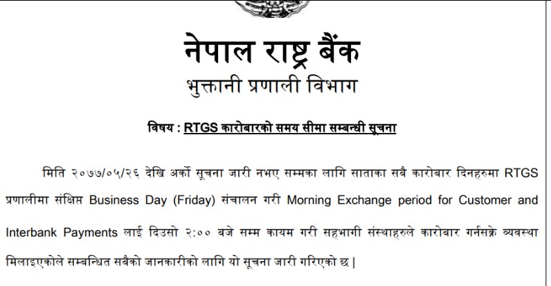 राष्ट्र बैंकल भदौ २६ गत शुक्रबारदेखि अर्को सूचना जारी नभएसम्मका लागि साताका सबै कारोबार दिनहरुमा आरटिजिएस प्रणालीमा संक्षिप्त बिजनेस डे (शुक्रबार) मर्निङ एक्सचेन्ज पिरियड फर कस्टुमर एण्ड इन्टर बैंक पेमेन्ट लाई दिउसो २ बजेसम्म कायम गरेको राष्ट्र बैंकले जनाएको हो ।