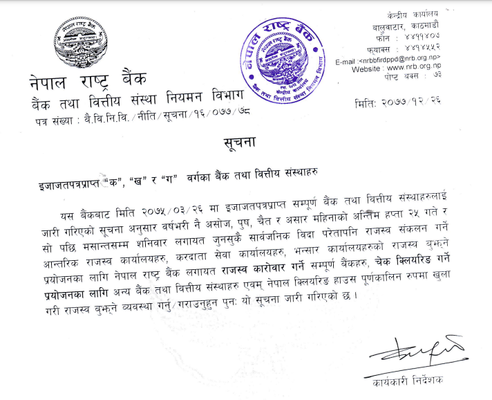 नेपाल राष्ट्र बैंकले बैंक तथा वित्तीय संस्थाको राजश्वको कारोबार गर्ने बैंक तथा वित्तीय संस्थाका राजश्व संकलन गर्ने सम्पूर्ण काउन्टर, करदाता सेवा कार्यालयहरु, चेक क्लियरिङ गर्नको लागि अन्य बैंक तथा वित्तीय संस्था र क्लियारिंग हाउसका काउन्टरहरु पुर्णकालिन रुपमा खुला गर्न निर्देशन दिएको हो ।