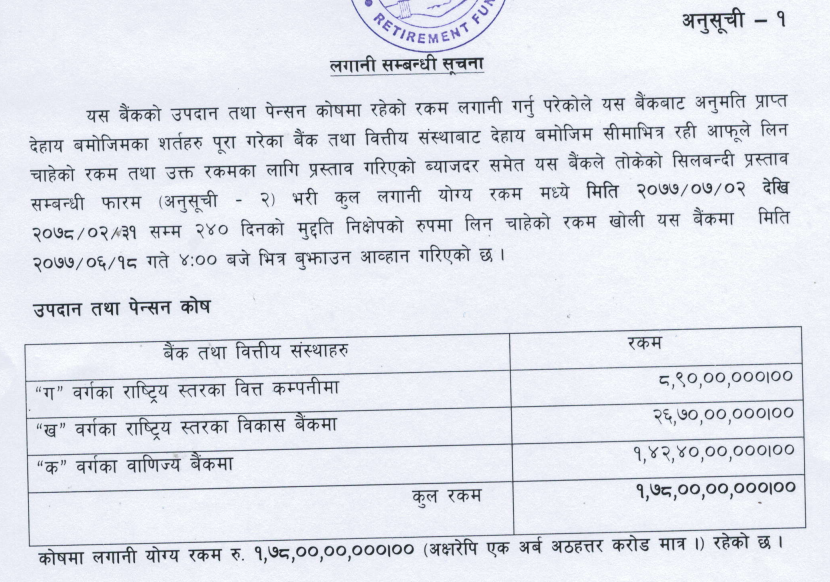 काठमाडौं । नेपाल राष्ट्र बैंकले उपदान तथा पेन्सन कोषमा रहेको एक अर्ब ७८ करोड रुपैयाँ मुद्दती निक्षेपमा लगानी गर्ने भएको छ। राष्ट्र बैंकले वाणिज्य बैंक, विकास बैंक र फाइनान्स कम्पनीहरुको २४० दिने निक्षेपमा लगानी गर्ने बताएको छ ।