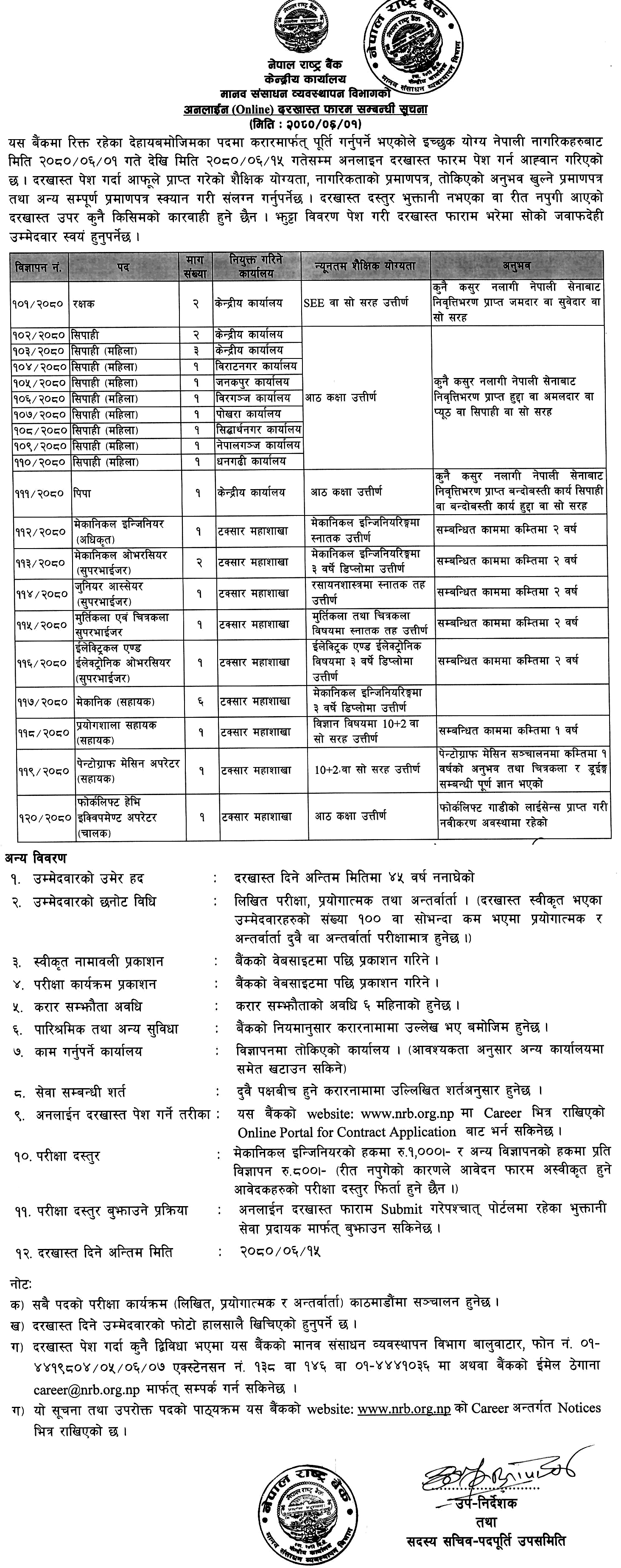 काठमाडौं । नेपाल राष्ट्र बैंकले रिक्त रहेका विभिन्न पदहरुका लागि धेरै संख्यामा कर्मचारी माग गरेको छ । राष्ट्र बैंकले एक सूचना जारी गर्दै ३० जना करार सेवाका लागि कर्मचारी माग गरेको हो । बैंकले सातै प्रदेशका विभिन्न कार्यालयका लागि कर्मचारी माग गरेको जनाएको छ । बैंकले सिपाही देखि मेकानिकल इन्जिनियर लगायतका विभिन्न धेरै पदहरुका लागि कुल ३० जना कर्मचारी माग गरेको हो । पदहरुमा आवेदन दिनको लागि आठ कक्षा पासदेखि प्लस टु तह उत्तिर्ण गरेको हुनुपर्नेछ । ईच्छुक तथा योग्यता पुगेकाले असोज १५ गतेभित्र आवेदन दिन सक्नेछन् ।