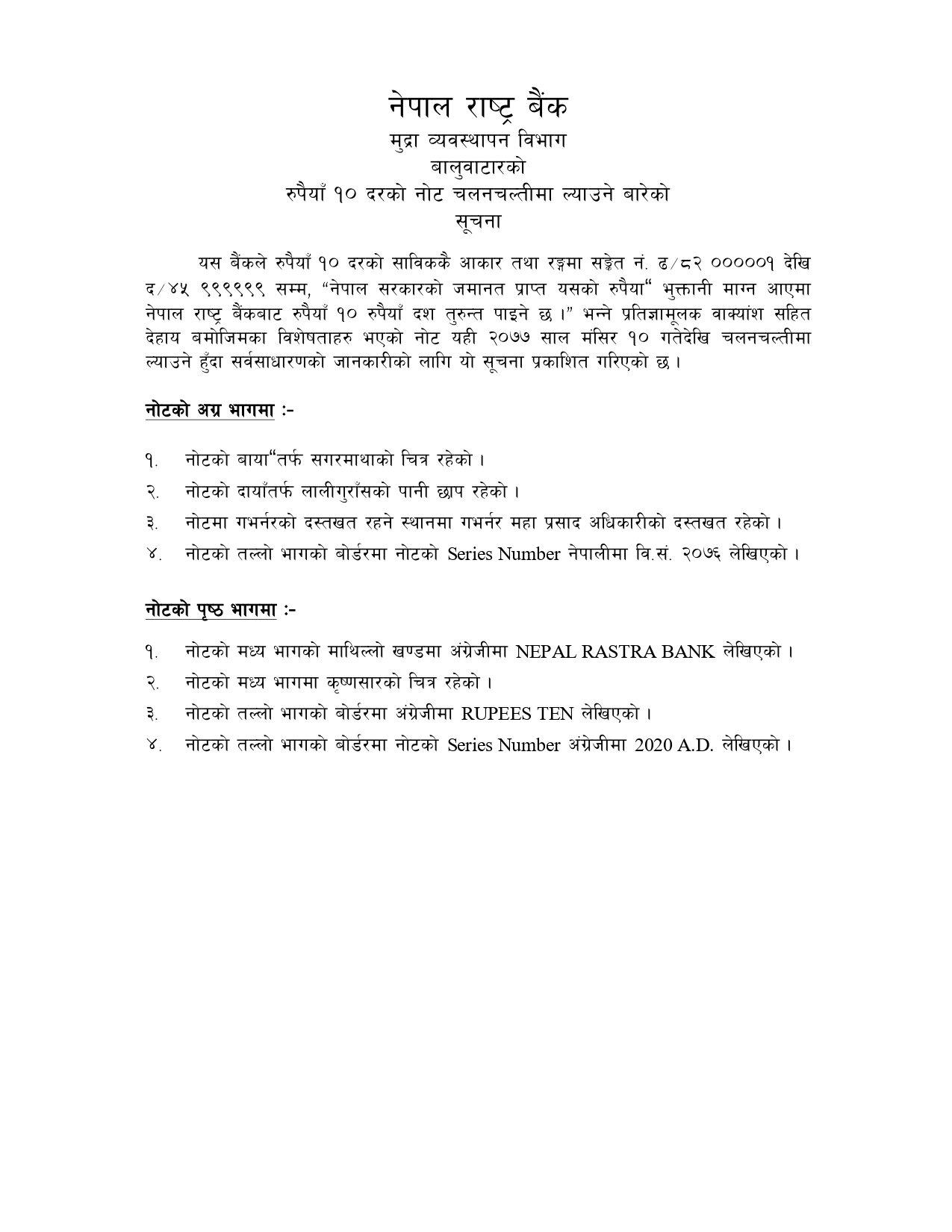 काठमाडौ। नेपाल राष्ट्र बैंकले १० रुपैयाँको नोट चलन चल्तीमा ल्याउने भएको छ । मंसिर १० गते नेपाल राष्ट्र बैंकको मुद्रा व्यवस्थापन विभागले सूचना जारी गर्दै १० रुपैयाँको नोट चलन चल्तीमा ल्याएको जनाएको हो ।