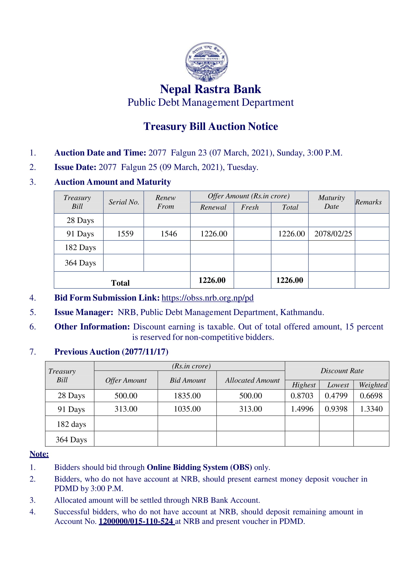 आज ३ बजे बोलकबोल भएर फागुन २५ गते, ट्रेजरी बिल बिक्री हुने बैंकले जनाएको छ । उक्त ट्रेजरी बिल २०७८ साल जेठ २५ गते परिपक्क हुने बैंकले जनाएको छ ।