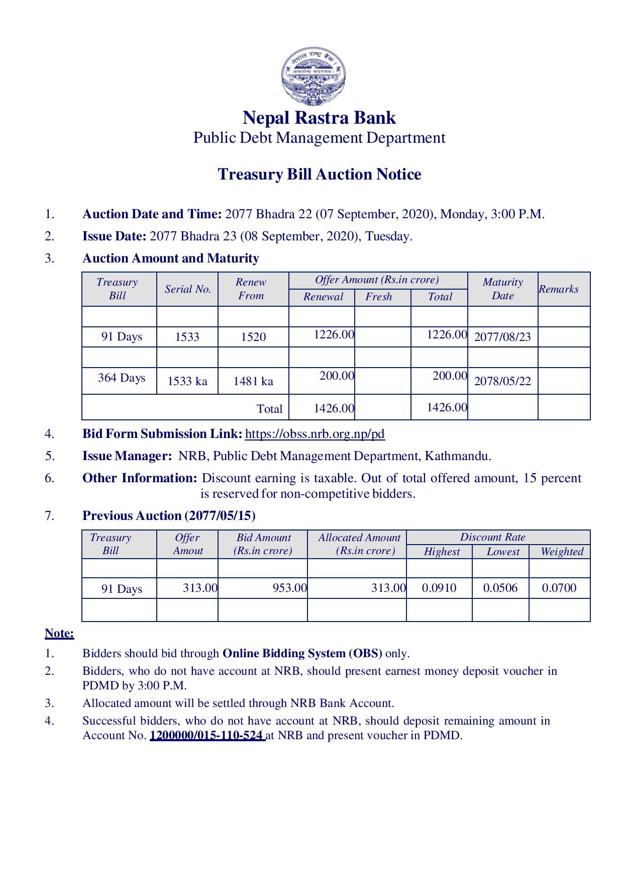 ट्रेजरी बिल खरिद गर्नका लागि भाद्र २२ गते सोमबार ३ बजेसम्म अनलाईन बोलकबोलमा सहभागी बन्नुपर्ने राष्ट्र बैंकले बताएको छ । उक्त ट्रेजरी बिल भाद्र २३ गते मंगलबार जारी हुनेछ ।