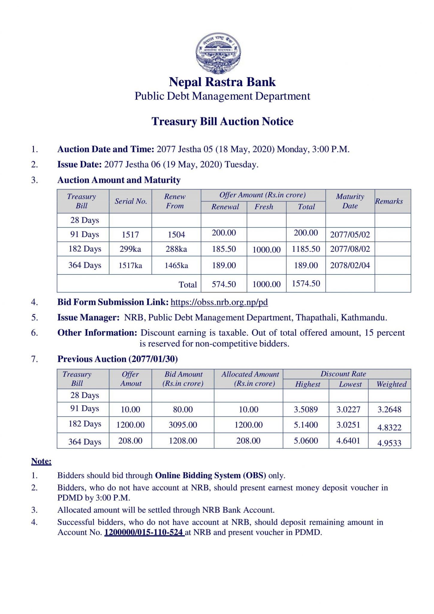 उक्त बिल खरीदका लागि लगानीकर्ताले अनलाइनमार्फत बोलकबोल गर्नुपर्ने नेपाल राष्ट्र बैंकले जनाइएको छ ।