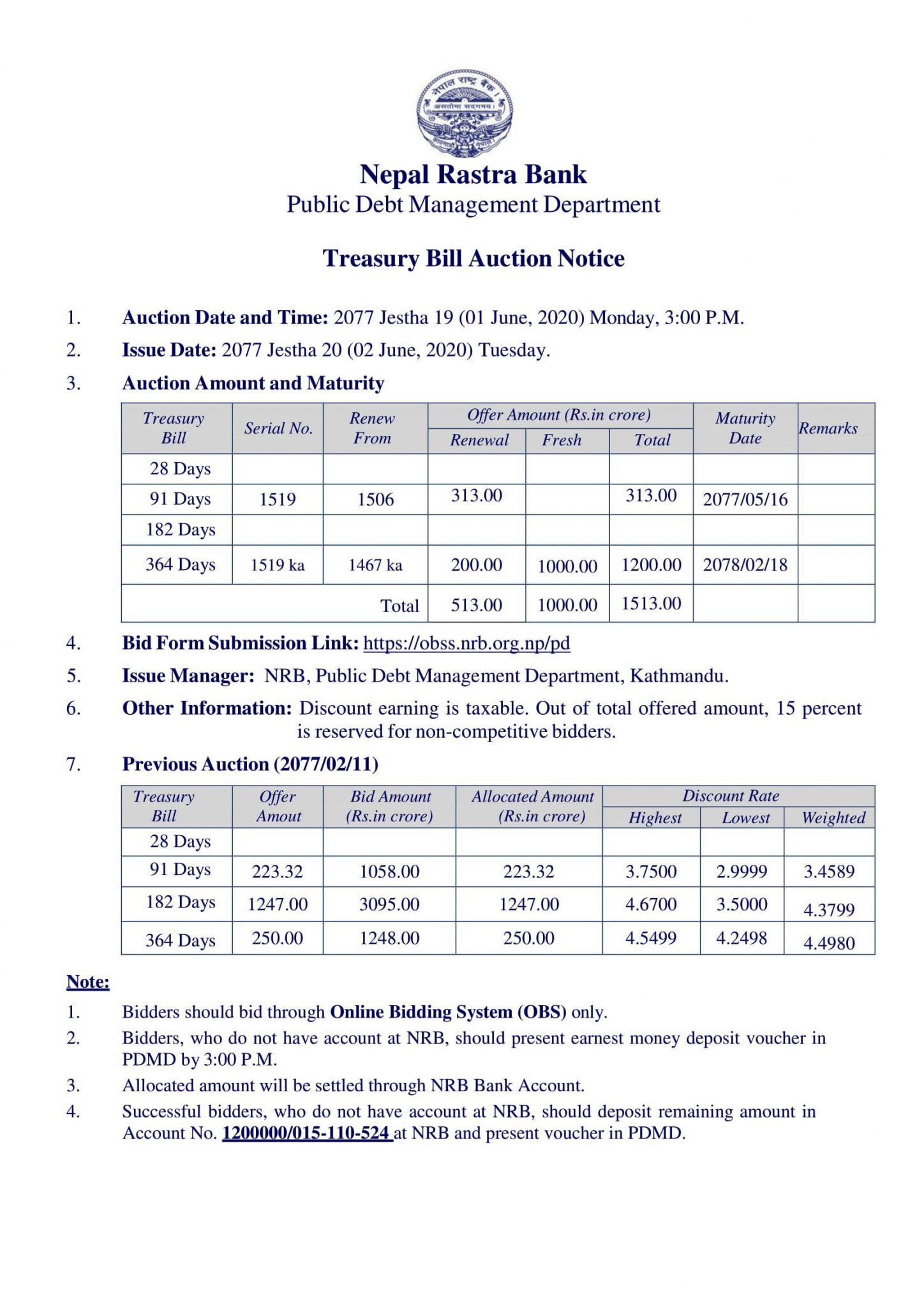 नेपाल राष्ट्र बैंकले १५ अर्ब १३ करोड रुपैयाँको ट्रेजरी बिल जारी गर्ने
