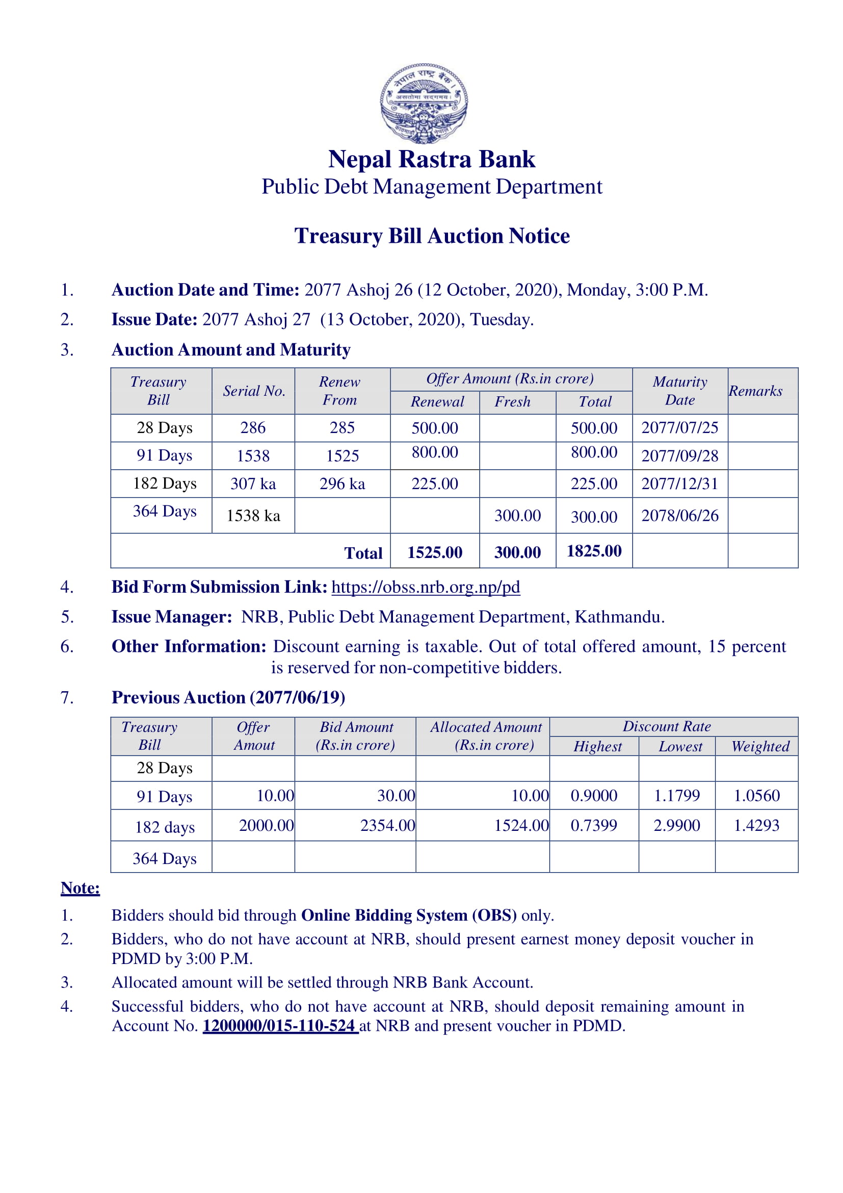 बैंकले ३६४ दिनको अवधिको लागि ३ अर्ब रूपैयाँ बराबरको नयाँ ट्रेजरी बिल बिक्री गर्न लागेको हो । बोलकबोल प्रक्रियाका माध्यमबाट जारी गर्न लागिएको उक्त ट्रेजरी बिल २०७८ साल असोज २६ गते परिपक्क हुनेछ ।