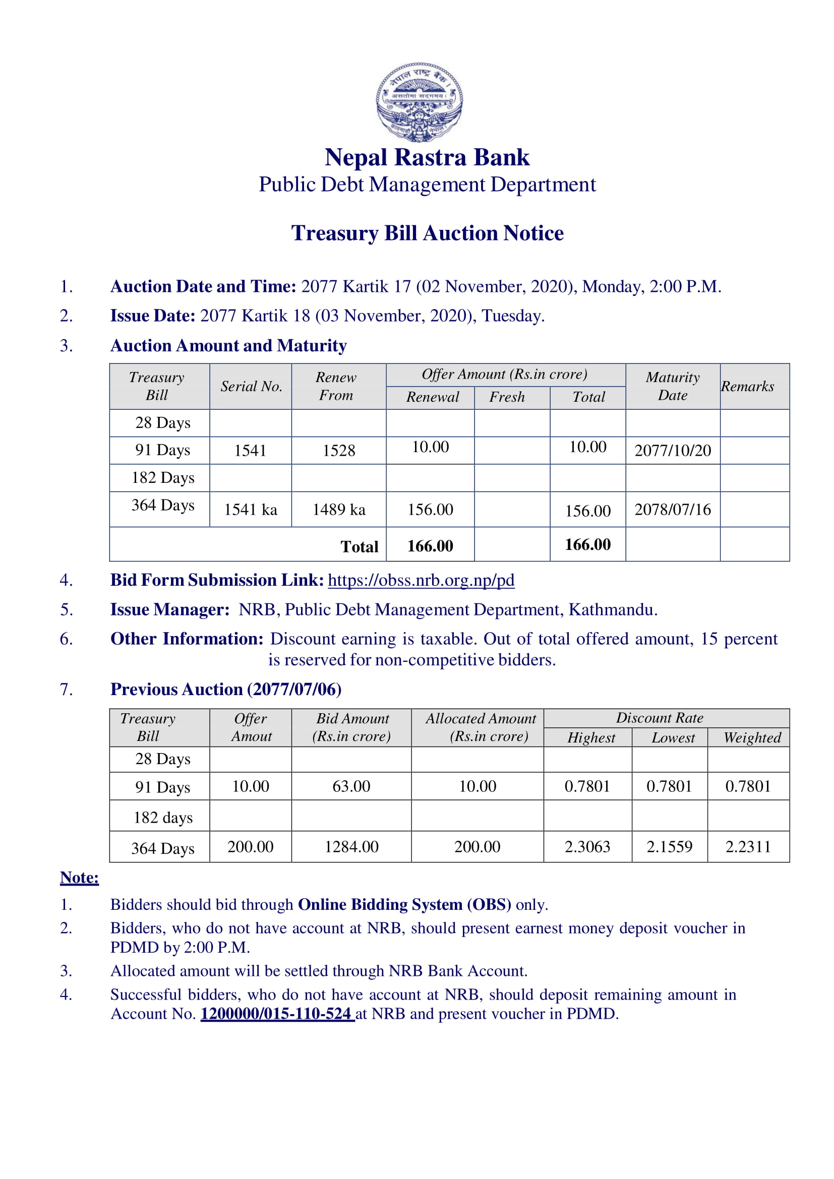 त्यस्तै, ३६४ दिनको अवधिको लागि १ अर्ब ५६ करोड रूपैयाँ बराबरको नयाँ ट्रेजरी बिल बिक्री गर्न लागेको हो । उक्त ट्रेजरी बिल २०७८ साल कार्तिक १६ गते परिपक्क हुने जनाएको छ ।