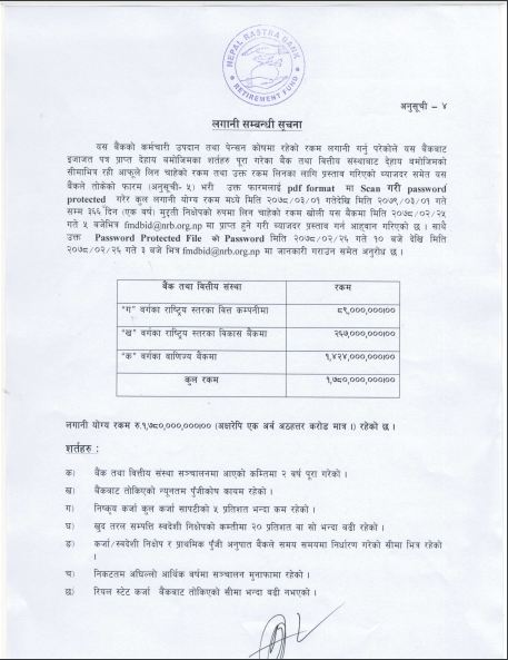 बैंकहरूले चाहेको रकम तथा उक्त रकमका लागि प्रस्ताव गरिएको ब्याजदर समेत खुलाई जेठ २५ गते दिउँसो ५ बजेभित्र पेश