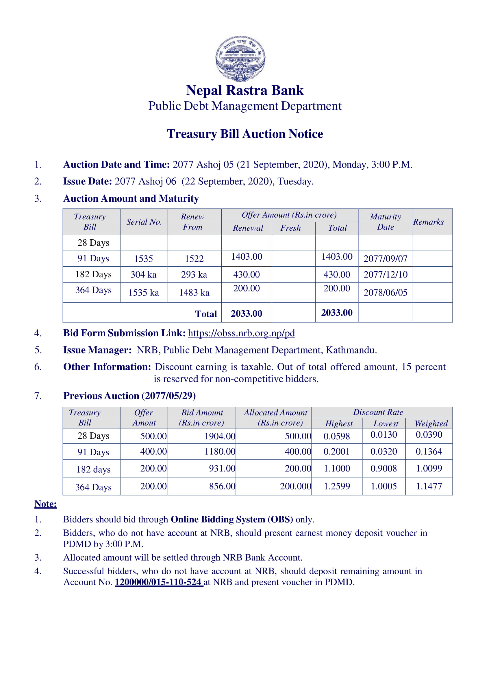 बैंकले ९१ दिनको अवधिका लागि १४ अर्ब ३ करोड रूपैयाँ बराबरको ट्रेजरी बिल बिक्री गर्नेछ । बोलकबोल प्रक्रियाका माध्यमबाट जारी गर्न लागिएको उक्त ट्रेजरी बिल २०७७ साल पुस ७ गते परिपक्क हुनेछ ।