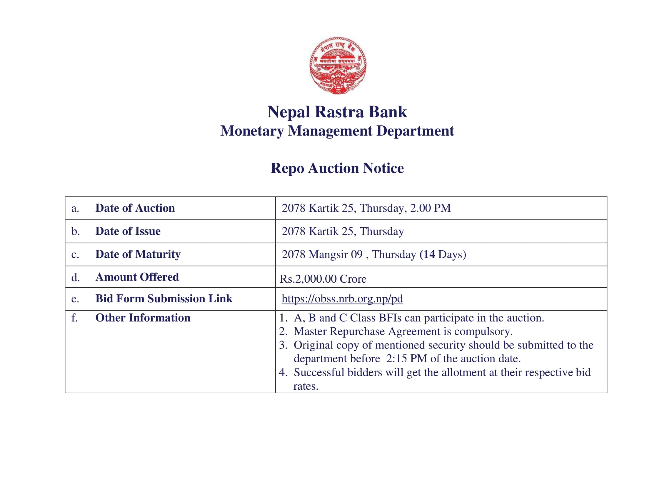 रिपोमा सहभागी हुन चाहने बैंक तथा वित्तीय संस्थाहरुले दिउँसो २ बजेसम्म बिडिङ गर्नुपर्नेछ । यस रिपो मंसिर ९ गते परिपक्क हुनेछ ।