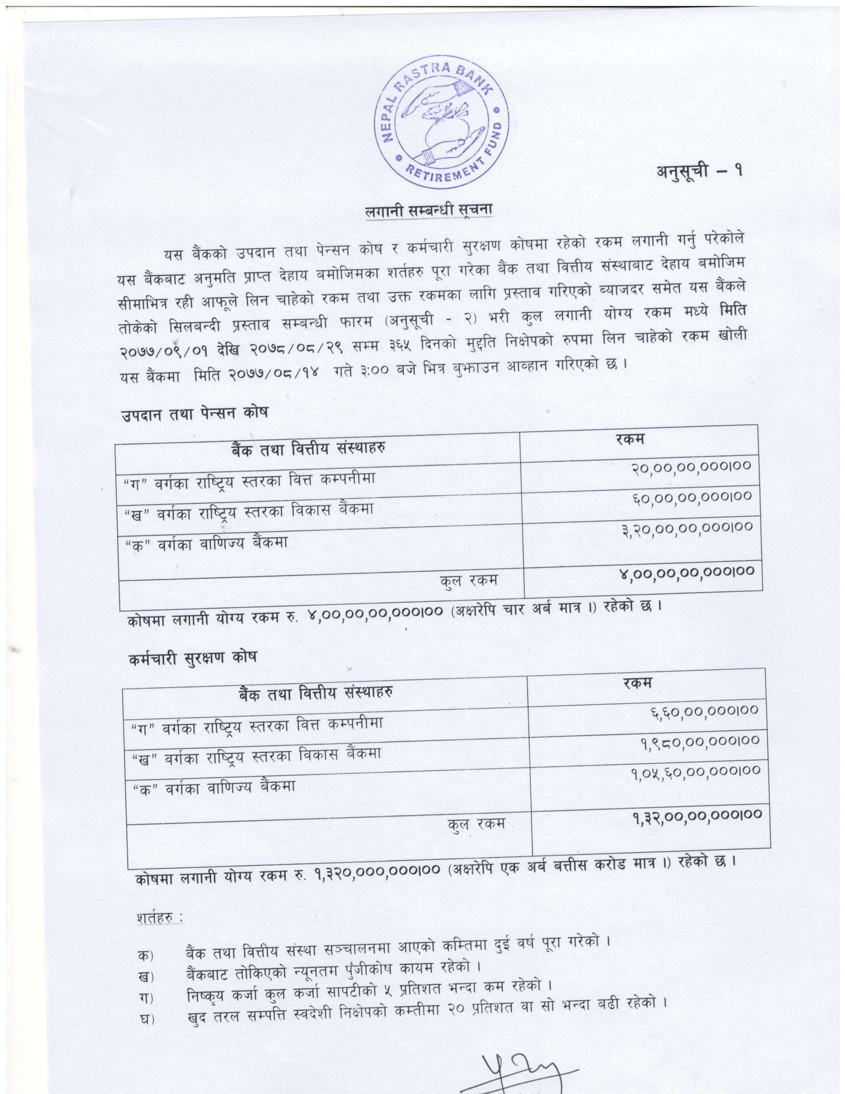 नेपाल राष्ट्र बैंकले ‘क’ वर्गका वाणिज्य बैंकमा ३ अर्ब २० करोड रूपैयाँ, ‘ख’ वर्गको विकास बैंकमा ६० करोड रुपैयाँ र ‘ग’ वर्गका राष्ट्रिय स्तरका वित्त कम्पनीहरुमा २० करोड रुपैयाँ लगानी गर्न लागेको हो ।