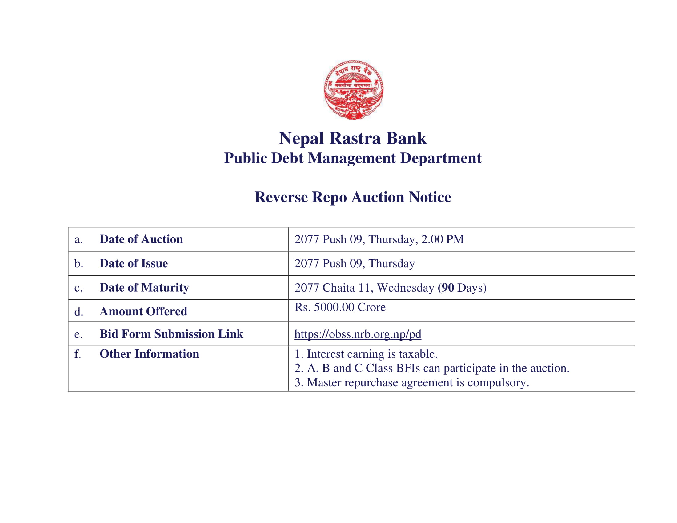 बैंकले ९० दिन अवधिका लागि बोलकबोल गर्न लागिएको उक्त रिभर्स रिपोमा वाणिज्य बैंक, विकास बैंक र वित्तीय संस्थाहरुले लगानी गर्न पाउनेछन् ।