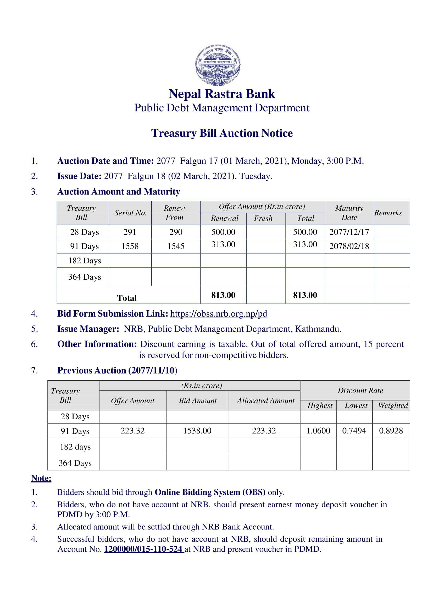 उक्त ट्रेजरी बिल चैत्र १७ गते परिपक्क हुनेछ । यसैगरी, बैंकले ९१ दिनको अवधिको लागि ३ अर्ब १३ करोड रूपैयाँ बराबरको ट्रेजरी बिल बिक्री गर्न लागेको हो । उक्त ट्रेजरी बिल २०७८ साल जेठ १८ गते परिपक्क हुनेछ ।