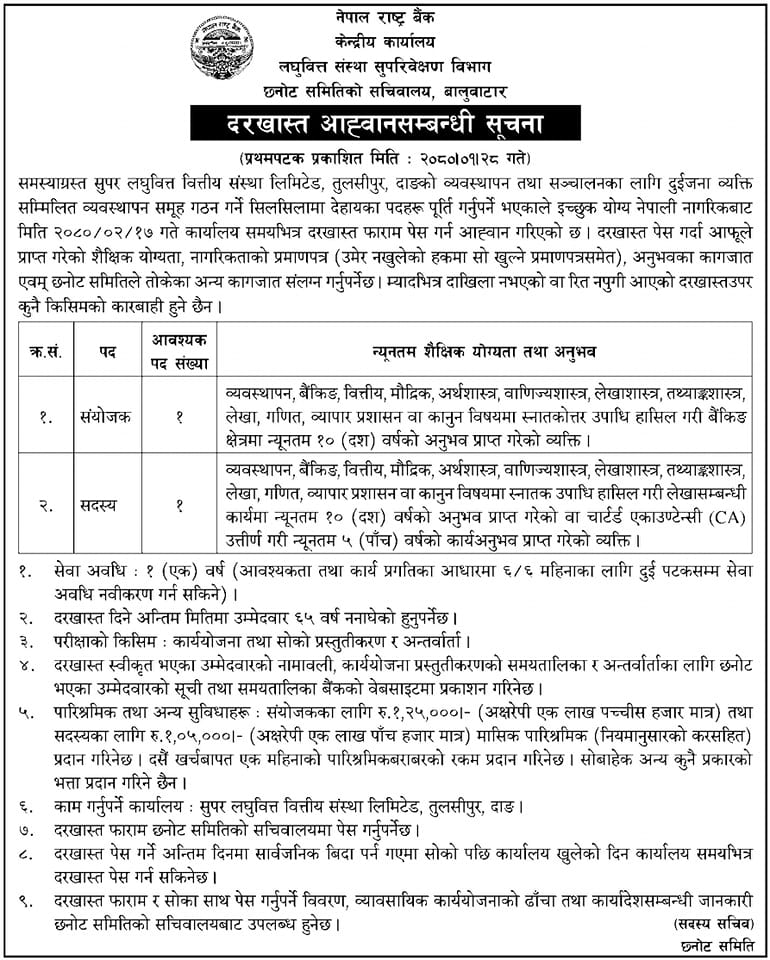 काठमाडौं । नेपाल राष्ट्र बैकले कर्मचारी माग गरेको छ । बैंकले समस्याग्रस्त सुपर लघुवित्तको व्यवस्थापन तथा संचालनका लागि दुई जना कर्मचारी माग गरेको हो । बैंकले संयोजक र सदस्य पदका लागि कर्मचारी माग गरेको हो ।