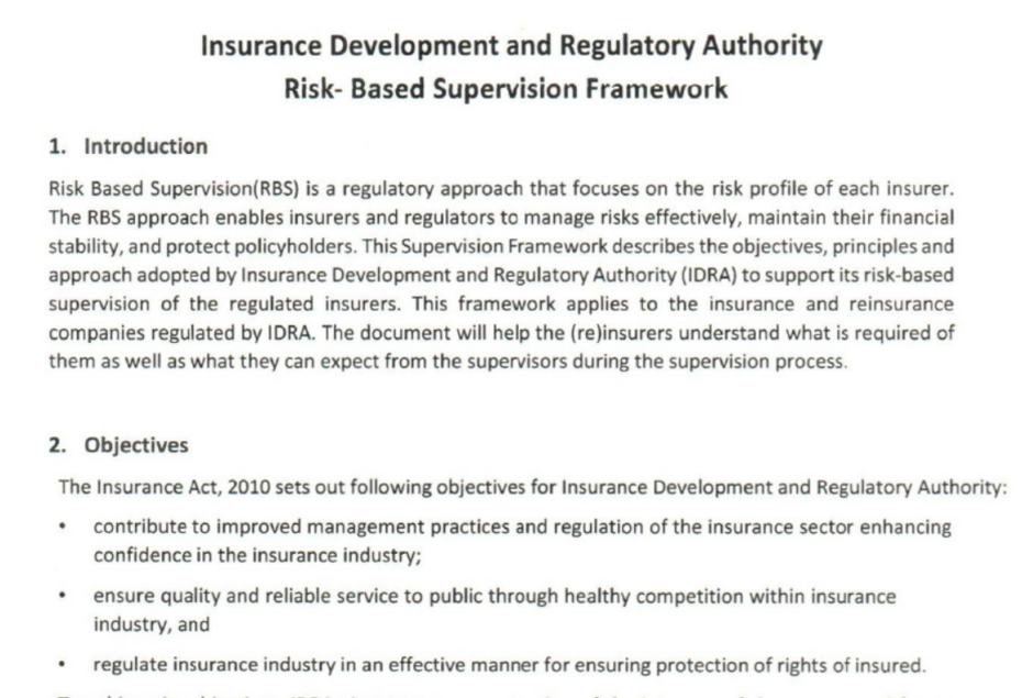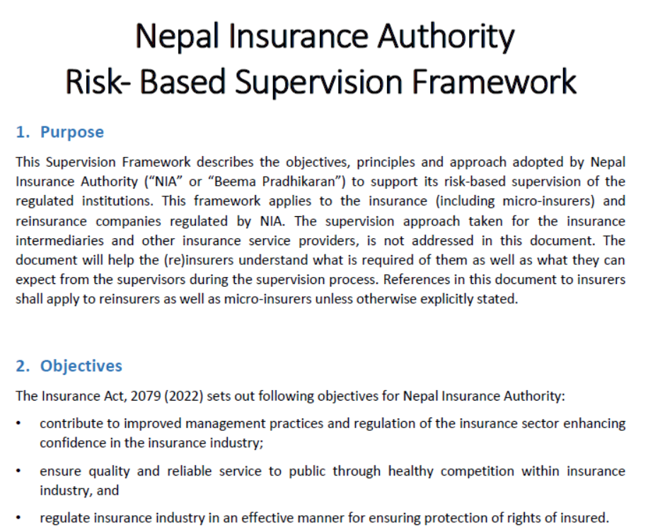 विश्व बैंकको सशर्त अनुदानमा दक्षिण एशियाली मुलुक नेपाल, श्रीलंका, भुटान, भारत, पाकिस्तान र बंगलादेशले जोखिममा आधारित सुपरिवेक्षण ढाँचा (रिस्क बेष्ड सुपरभिजन फ्रेमवर्क) लागू गरेका छन् । बीमा नियामकले बीमा कम्पनीको सुपरिवेक्षणलाई परम्परागतरूपमा नभएर जोखिममा आधारित भएर गर्नुपर्ने अवधारणाको आधारमा यो सुपरिवेक्षण ढाँचा लागू गरिएको हो ।