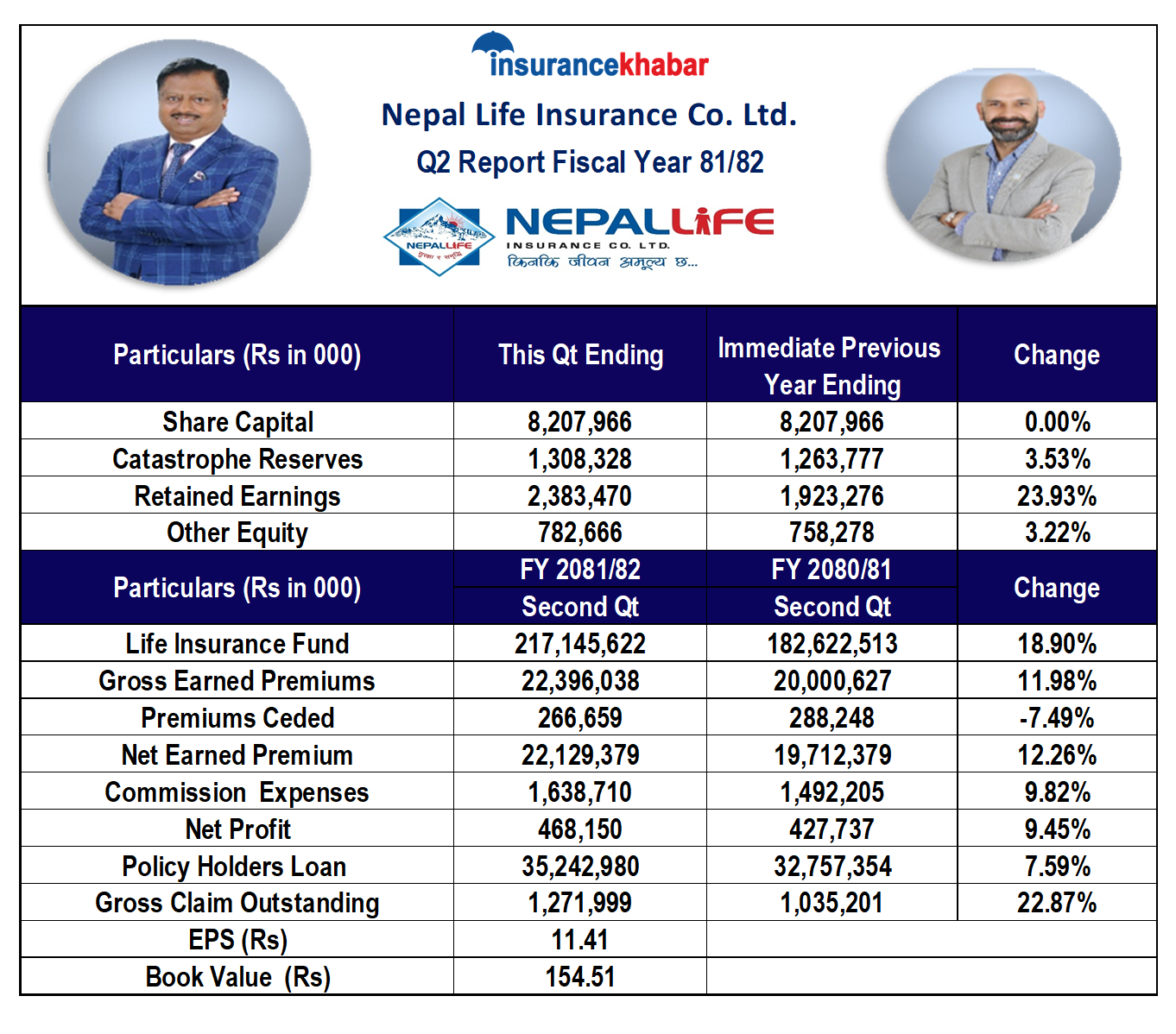 काठमाडौं । नेपाल लाइफ इन्स्योरेन्सले चालु आर्थिक वर्षको दोस्रो त्रैमास (साउन–पुस)सम्मको अपरिष्कृत वित्तीय विवरण सार्वजनिक गरेको छ । कम्पनीले प्रकाशन गरेको वित्तीय विवरण अनुसार कम्पनीको अधिकांश सूचकमा बृद्धि भएको छ ।