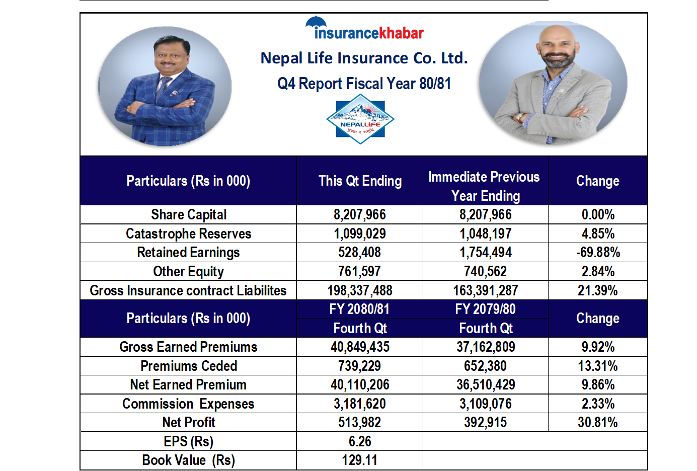 काठमाडौं । नेपाल लाइफ इन्स्योरेन्स कम्पनी लिमिटेडले गत आर्थिक वर्ष २०८०/८१को चौथो त्रैमासको वित्तीय विवरण प्रकाशन गरेको छ ।