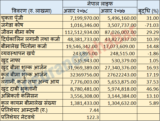 जीवन बीमा कोष २९ प्रतिशतले बढाउन सफल देखिए पनि गत वर्ष ५१ प्रतिशतले लाभांस दिएका कारण जगेडा कोष भने ७१ प्रतिशतले घटेको छ । कम्पनीको जगेडा कोष तीन अर्ब ५० करोड रुपैयाँबाट एक अर्ब एक करोड रुपैयाँमा झरेको हो । यस सँगै कम्पनीको लाभास दिन सक्ने क्षमता पनि घटेको छ । कम्पनीले २०७५/७६ को साधारणसभाबाट ३१ प्रतिशतले बोनस शेयर दिएर चुक्ता पूँजी ७ अर्ब १९ करोड रुपैयाँ पुर्याउन सफल भएको छ । पूँजीका हिसावले नेपाल लाइफ सबैभन्दा बलियो कम्पनी हो ।