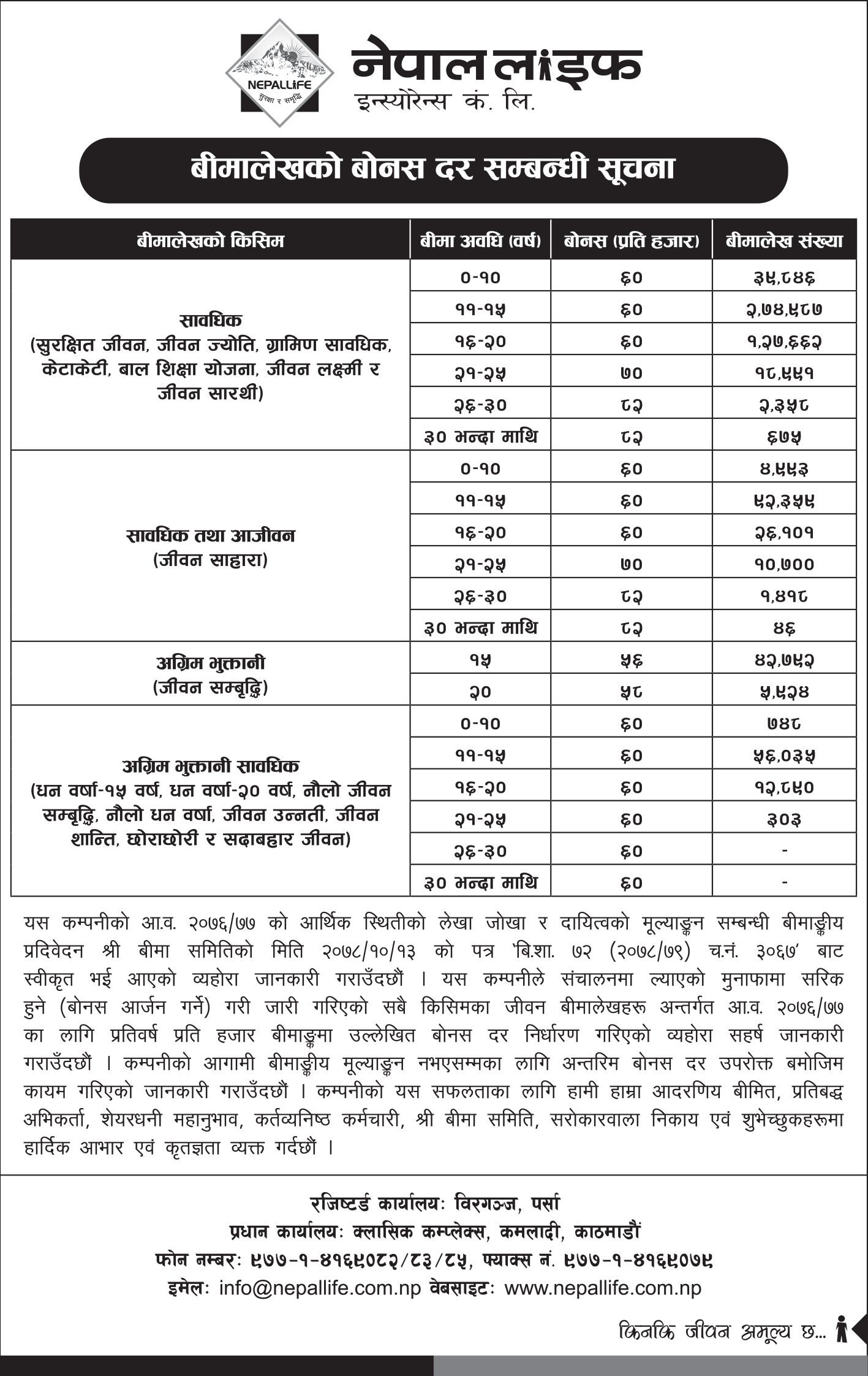 नेपाल लाइफ इन्स्योरेन्स कम्पनीले आर्थिक वर्ष २०७६ /७७ को लागि नयाँ बोनसदर घोषणा गरेको छ । कम्पनीको आर्थिक वर्ष २०७६/२०७७ को आर्थिक लेखाजोखा र दायित्वको मुल्याङकन सम्बन्धी बीमाङकीय प्रतिवेदन बीमा समितिको माघ १३ गतेको पत्र मार्फत स्वीकृत भई कम्पनीको मुनाफामा सरिक हुने गरी जारी गरिएको सबै बीमालेखहरुमा बोनस दर, मृत्यु दाबी,पुर्ण वा आंशिक अवधि भुक्तानी दाबी, समर्पण मुल्य दाबी, चुक्ता मुल्य दाबी तथा चालु बीमालेखमा समेत लागु हुनुका साथै बीमा समितिबाट अर्को वर्षको बीमाङकीय मुल्याङकन स्वीकृत नभएसम्मका लागि यस कम्पनीले उक्त बोनसदर कायम हुने गरी सार्वजनिक गरेको हो ।
