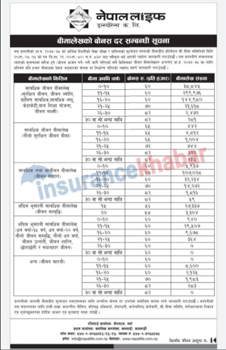 नेपाल लाइफ इन्स्योरेन्स कम्पनीले आर्थिक वर्ष २०७७ /७८ को लागि नयाँ बोनसदर घोषणा गरेको छ । कम्पनीको आर्थिक वर्ष २०७७/२०७८ को आर्थिक लेखाजोखा र दायित्वको मुल्याङकन सम्बन्धी बीमाङकीय प्रतिवेदन बीमा समितिको भदौ १५ गतेको पत्र मार्फत स्वीकृत भई कम्पनीको मुनाफामा सरिक हुने गरी जारी गरिएको सबै बीमालेखहरुमा बोनस दर, मृत्यु दाबी,पुर्ण वा आंशिक अवधि भुक्तानी दाबी, समर्पण मुल्य दाबी, चुक्ता मुल्य दाबी तथा चालु बीमालेखमा समेत लागु हुनुका साथै बीमा समितिबाट अर्को वर्षको बीमाङकीय मुल्याङकन स्वीकृत नभएसम्मका लागि यस कम्पनीले उक्त बोनसदर कायम हुने गरी सार्वजनिक गरेको हो ।
