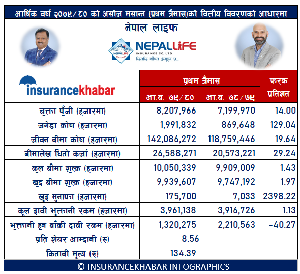 काठमाडौं । नेपाल लाइफ इन्स्योरेन्सले चालु आर्थिक वर्ष (७९/८०) को पहिलो त्रैमासको वित्तीय विवरण सार्वजनिक गरेको छ । सार्वजनिक गरिएको वित्तीय विवरण अनुसार कम्पनीले प्रथम तीन महिनामा १० अर्ब ५ करोड कुल बीमा शुल्क आर्जन गरेको छ । गत आर्थिक वर्षको सोही अवधिमा कम्पनीले ९ अर्ब ९० करोड कुल बीमा शुल्क आर्जन गरेको थियो । समिक्षा अवधिमा कुल बीमा शुल्क आर्जनमा करिव १ दशमलव ४३ प्रतिशतको वृद्धि देखिएको छ । त्यस्तै कम्पनीले ९ अर्ब ९३ करोड खुद बीमा शुल्क आर्जन गरेको छ ।