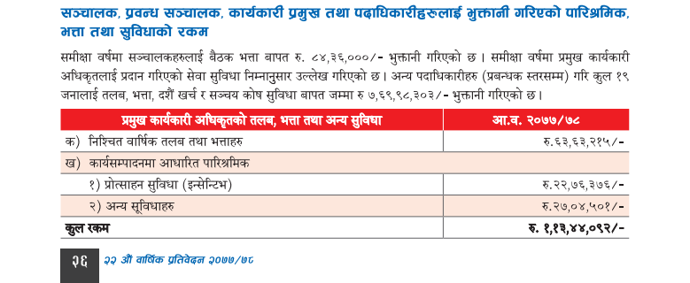 यस आर्थिक वर्षमा सञ्चालकहरुले बैठक भत्ता बापत ८४ लाख ३६ हजार रुपैयाँ बुझेको पाइएको छ । त्यस्तै उच्च व्यवस्थापन तहका १९ जना कर्मचारीले तलब भत्ता दशै खर्च र सञ्चयकोष सुविधा बापत ७ करोड ६९ लाख प्राप्त गरेका छन् ।