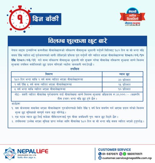 काठमाडौं । नेपाल लाइफ इन्स्योरेन्स कम्पनीले व्यतित बीमालेख नविकरण गर्दा ब्याज छुटकोयोजना सार्वजनिक गरेको छ । कम्पनीले जारी गरेको बीमालेख अन्तर्गत १८० वा सोभन्दा बढी समयदेखि व्यपतत भई पुनर्जागरण तोकिएको प्रक्रिया पुरा गर्नुपर्ने गरी व्यतित भएका बीमालेखहरुमा साउन १० गतेदेखि असार २२ गतेसम्म ब्यतित भएका बीमालेखहरु रकम भुक्तानी गरी सुचारु गरेमा बीमालेख नविकरण शूल्कमा लाग्ने व्याजमा छुट प्रदान गरिएको जनाएको छ ।