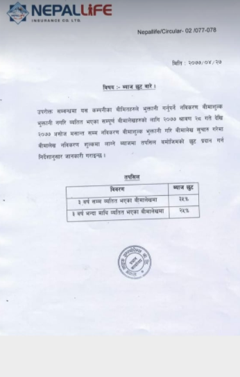 कम्पनीले जारी गरेको बीमालेख अन्तर्गत साउन २८ गतेदेखि असोज मसान्तसम्म ब्यतित भएका बीमालेखहरु रकम भुक्तानी गरी सुचारु गरेमा बीमालेख नविकरण शूल्कमा लाग्ने व्याजमा छुट प्रदान गरिएको जनाएको छ ।