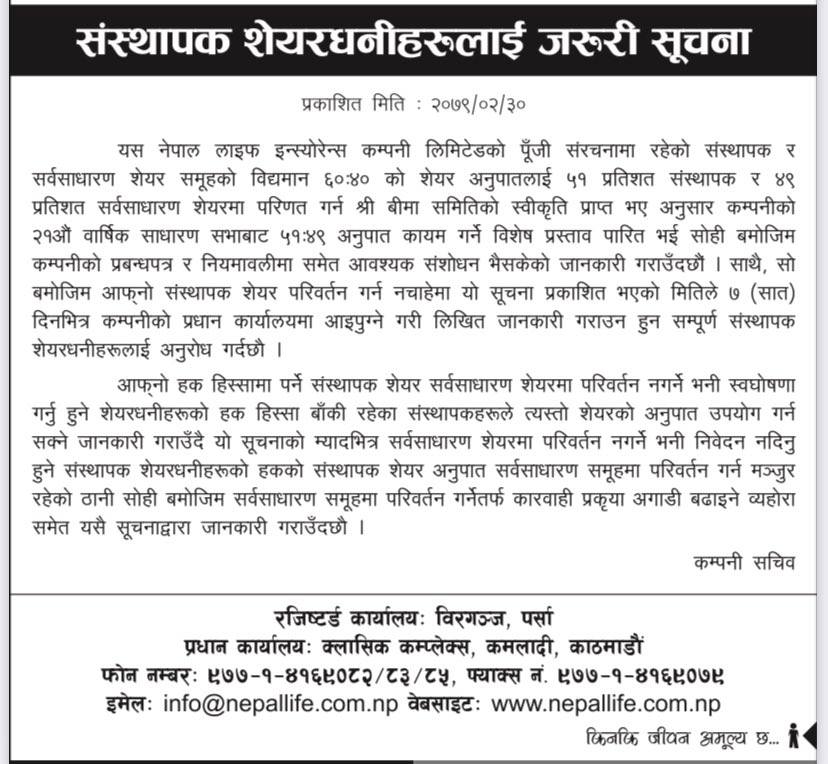 कम्पनीले हाल कायम शेयर स्वामित्व परिवर्तनको प्रस्ताव नियामक निकाय बीमा समितिबाट स्वीकृत गराई २१औं वार्षिक साधारण सभाबाट पनि पारित गरिसकेको छ । यदि आफ्नो स्वामित्वको शेयर परिवर्तन गर्न नचाहने संस्थापक शेयरधनीहरूलाई आगामी ७ दिनभित्र लिखित जानकारी गराउन कम्पनीले आग्रह गरेको छ ।