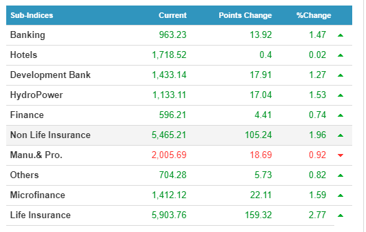 जीवन बीमा र निर्जीवन बीमा कम्पनीको उपसुचकमा वृद्धि आएको छ ।