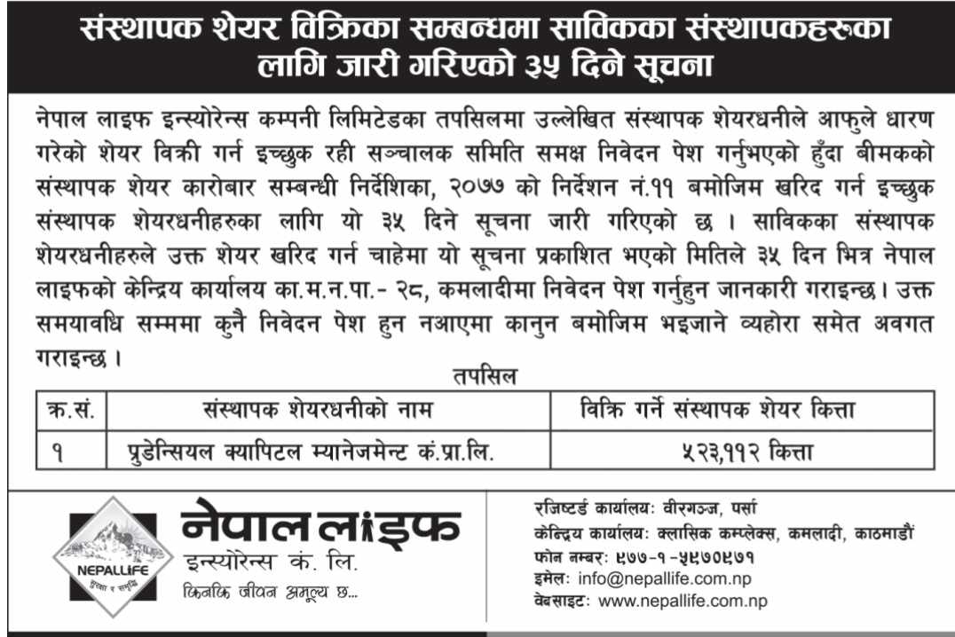 काठमाडौं । नेपाल लाइफ इन्स्योरेन्स कम्पनी लिमिटेडले प्रुडेन्सियल क्यापिटल म्यानेजमेन्ट कम्पनी प्राइभेट लिमिटेडको नाममा रहेको ५ लाख २३ हजार ११२ कित्ता संस्थापक शेयर विक्रीमा ल्याएको छ । उक्त शेयर विद्यमान संस्थापक शेयरधनीहरूले मात्र खरीद गर्न पाउने गरी विक्रीमा लयाएको कम्पनीले जनाएको छ ।