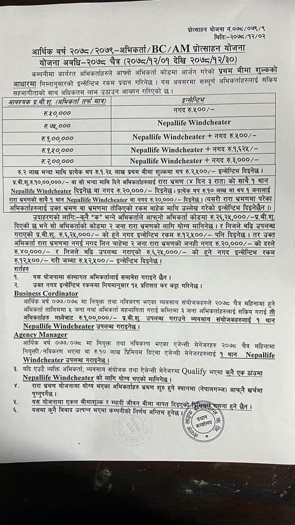 ५० हजार रुपैयाँ प्रथम बीमा शुल्क आर्जन गर्ने अभिकर्ताले ५०० रुपैयाँ पाउने छन् । ७५ हजार रुपैयाँ प्रथम बीमा शुल्क आर्जन गर्ने अभिकर्ताले ‘नेपाल लाइफ विण्डचिटर’, एक लाख रुपैयाँ प्रथम बीमा शुल्क आर्जन गर्नेले विण्डचिटर सहित १६२५ रुपैयाँ, एक लाख ५० हजार रुपैयाँ आर्जन गर्ने विण्डचिटर सहित १६२५ र २ लाख रुपैयाँ प्रथम बीमा शुल्क आर्जन गर्नेले विण्डचिटर सहित ३ हजार रुपैयाँ दिने छ ।