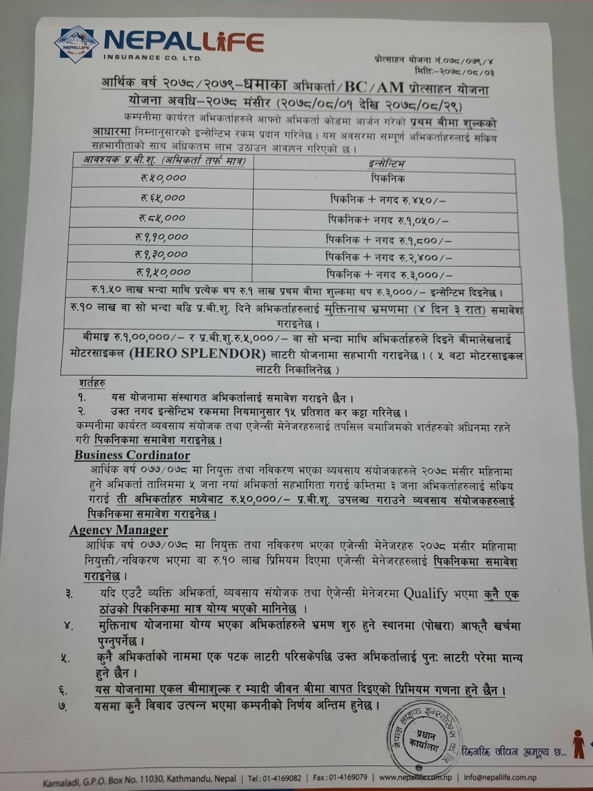 विजनेस कोर्डिनेटरको हकमा भने मंसिर महिनामा हुने अभिकर्ता तालिममा ५ जना नयाँ अभिकर्तालाई सहभागिता गराई कम्तिमा तीन अभिकर्ताहरुलाई सक्रिय गराई उनिहरु मध्येबाट एकले ५० हजार रुपैयाँ प्रथम बीमा शुल्क आर्जन गरेपछि मात्रै पिकनिकमा सहभागि हुन पाइनेछ । त्यस्तै मंसिर महिनामा नियुक्ति वा नविकरण भएका एजेन्सी म्याजरहरु स्वत पिकनिकमा सहभागि हुने पाउने छन् । वा १० लाख रुपैयाँ प्रिमियम दिएका एजेन्सी म्यानेजरहरु पिकनिकमा समावेश हुन पाउने छन् ।