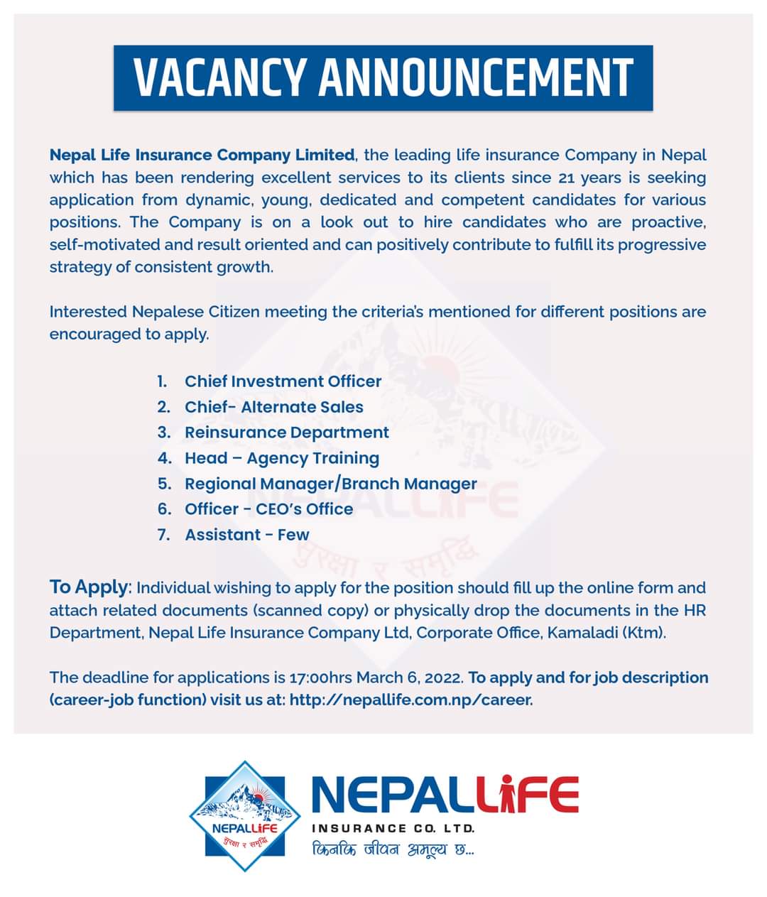 काठमाडौं । नेपाल लाइफ इन्स्योरेन्स कम्पनीले ७ पदका लागि धेरै संख्यामा कर्मचारीको माग गरेको छ । कम्पनीले एजेन्सी ट्रेनी, अफिसर, एसिस्टेन्ट, पुनर्बीमा विभाग, क्षेत्रीय प्रबन्धक तथा शाखा प्रबन्धक, सहायक लगायतका पदका लागि कर्मचारी माग गरेको एक सुचना जारी गर्दै जनाएको छ ।