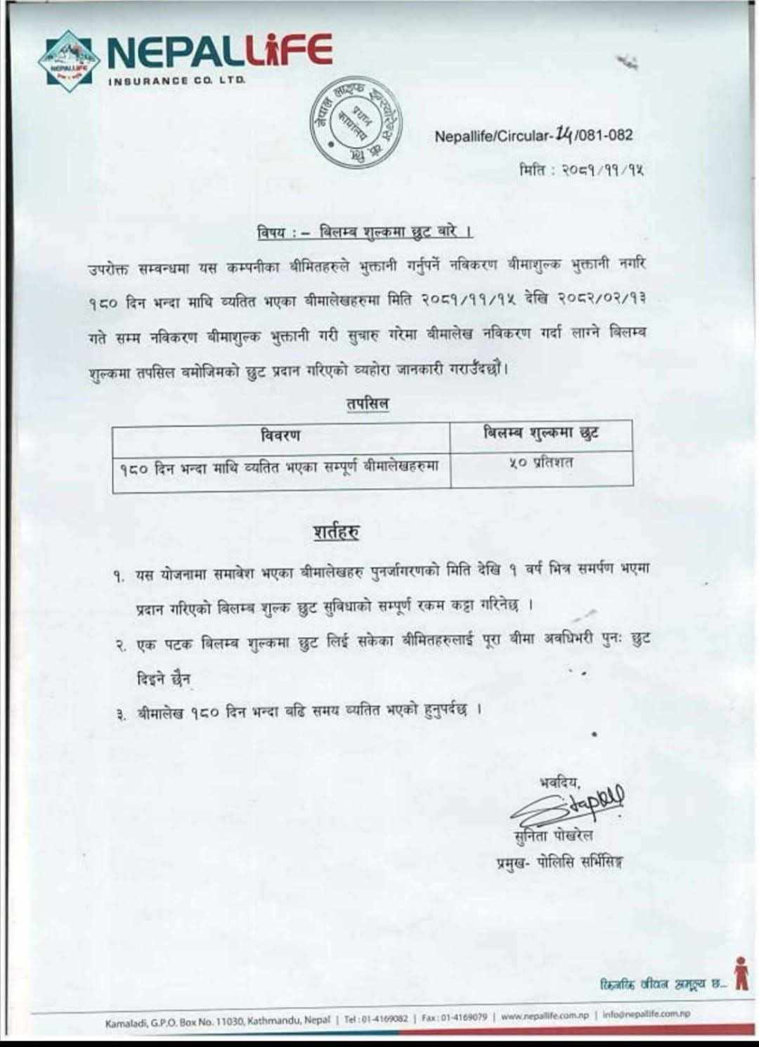 बीमितले भुक्तानी गर्नुपर्ने ििमतले १८० दिनभन्दा माथि व्यतित भएका बीमालेखहरुमा उक्त छुट प्रदान गर्ने भएको हो । यो योजनामा समावेश भएका बीमालेखहरु पुनर्जागरण मितिदेखि १ वर्षभित्र समर्पण भएमा प्रदान गरिएको विलम्ब शुल्क छुट सुविधाको सम्पूर्ण रकम कट्टा गरिने कम्पनीले जनाएको छ।