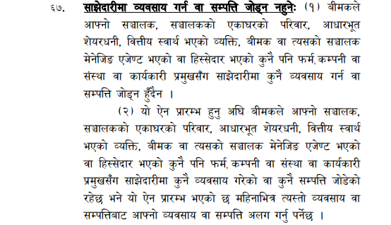 बीमा कम्पनीले आफ्नो सञ्चालक, सञ्चालकको एकाघरको परिवार, आधारभुत शेयरधनी, वित्तीय स्वार्थ भएको व्यक्ति, बीमक वा त्यसको सञ्चालक मनेजिङ एजेण्ट भएको वा हिस्सेदार भएको कुनै पनि फर्म, कम्पनी वा संस्था वा कार्यकारी प्रमुखसँग साझेदारीमा कुनै व्यवसाय गर्न वा सम्पत्ती जोड्न हुँदैन भनिएको छ । यो व्यवस्था सँगै अव कुनै पनि बीमा कम्पनीले नेपाल लाइफले जस्तै सञ्चालकलाई फाइदा पुग्ने गरि कुनै पनि क्षेत्रमा संयुक्त लगानी गर्न पाउने छैनन् ।