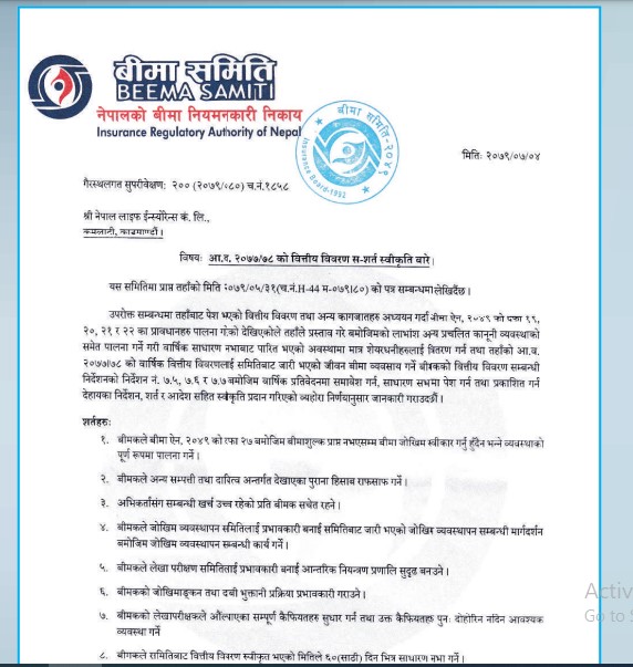 काठमाडौं । नेपाल लाइफ इन्स्योरेन्स कम्पनीलाई बीमा प्राधिकरणले ८ बुँदे निर्देशन जारी गरेको छ । बीमा प्राधिकरणले बीमा कम्पनीको वित्तीय विवरण स्वीकृत गर्दै यस्तो निर्देशन दिएको हो । बीमा प्राधिकरणले कम्पनीलाई आर्थिक बर्षको ७७र७८ को कम्पनीको वित्तीय विवरण बीमा ऐन अन्तर्गत साबिक बीमा समिति ( नेपाल बीमा प्राधिकरण) बाट जारी भएको जीवन बीमा व्यवसाय गर्ने बीमकको वित्तीय विवरण सम्बन्धी निर्देशनको निर्देशन नं.७, ५, ७.६ र ७.७ अनुरुप बार्षिक प्रतिवेदनमा समावेश गर्न र साधारणसभामा पेश गर्न शर्त र आदेश सहित स्वीकृति प्रदान गरिएको जनाएको छ ।
