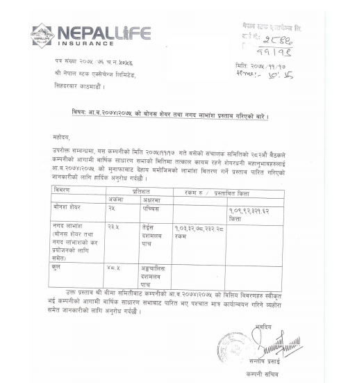 प्रस्तावित लाभांश बीमा समिति र आगामी वार्षिक साधारण सभा बाट पारित भए पछि वितरण हुने कम्पनीले जनाएको छ ।