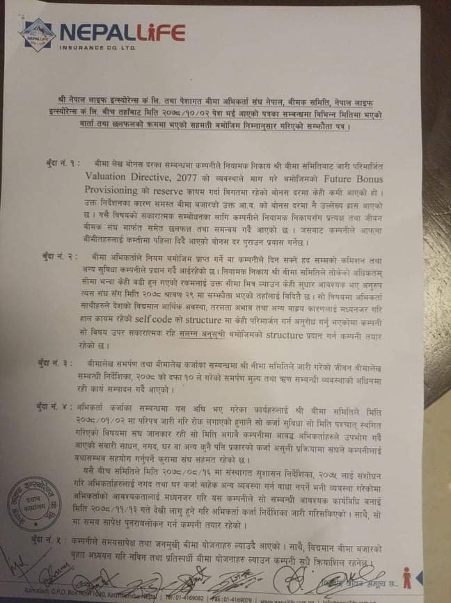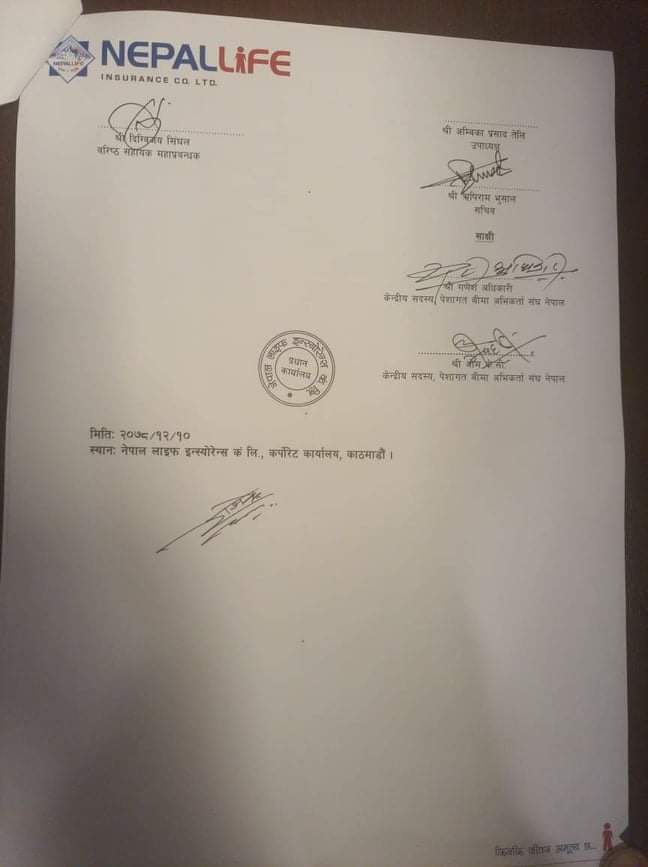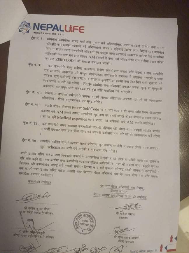 बुँदागत रुपमा जनाइएको प्रतिवद्धता बाहेक अन्य विषयहरु कम्पनीले जानकारीमा लिएको र सो उपर कम्पनीले आवस्यक छलफल गरी अघि बढ्ने सहमति भएको छ । सहतिपत्रमा कम्पनीको तर्फबाट कार्यबहाक प्रमुख कार्यकारी अधिकृत सुशील कुमार चौधरी, बरिष्ठ नायब प्रमुख कार्यकारी अधिकृत प्रविण रमण पराजुली र बरिष्ठ सहायक महाप्रबन्धक दिग्बिजय संघलले हस्ताक्षर गरेका छन् भने अभिकर्ताहरुको तर्फबाट पेशागत बीमा अभिकर्ता संघ नेपाल बीमक समिति नेपाल लाइफ इन्स्योरेन्स कम्पनीको तर्फबाट अध्यक्ष राजेन्द्र अमात्य, बरिष्ठ उपाध्यक्ष कृष्ण प्रसाद आचार्य, उपाध्यक्ष अम्बिका प्रसाद तेलि, सचिव ऋषिराम भुसाल र साक्षीमा पेशागत बीमा अभिकरत् संघ नेपालको केन्द्रिय सदश्य गणेश अधिकारी र ओम केसीले हस्ताक्षर गरेका छन् ।