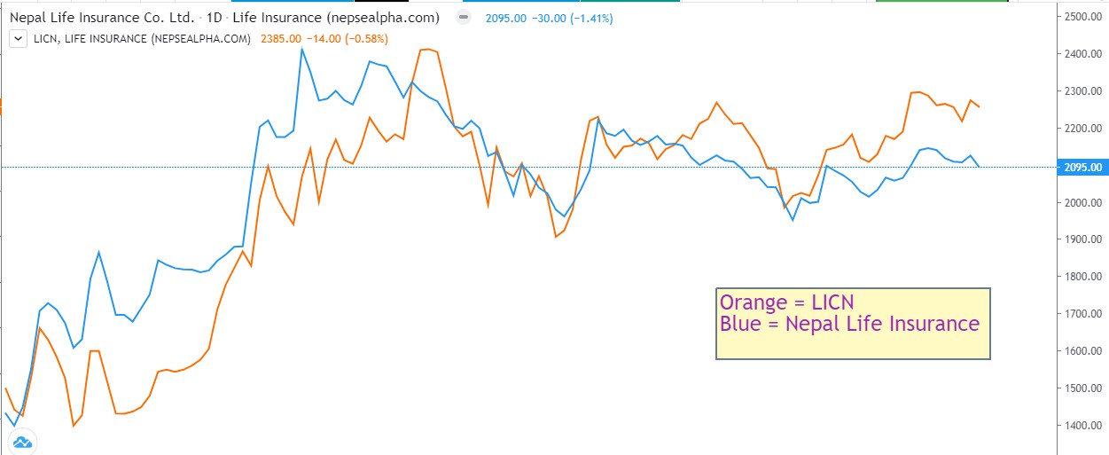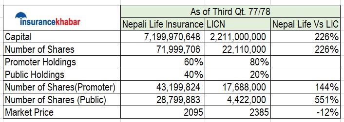 यो समाचार तयार पार्दा नेपाल लाईफको बजार मूल्य २०९५ रुपैयाँ रहेको छ भने एलआईसी नेपालको बजार मूल्य २३८५ रुपैयाँ रहेको छ। शेयर बजार भनेको कम्पनीको आधारभूत कुरा सँगै माग र आपुर्तीको कुरा पनि हो। आपुर्ती धेरै भएका शेयरमा बजार बजार मूल्यमा केही चाप आउने गर्छ । नेपाल लाइफको चुक्ता पूँजी ७ अर्ब १९ करोड हुँदा एलआईसी नेपालको चुक्ता पूँजी मात्र २ अर्ब २१ करोड छ ।