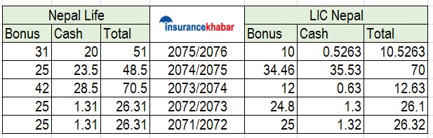 लाभांशको इतिहास हेर्दा विगत ५ वर्षमा नेपाल लाइफले २२२ प्रतिशत लाभांश दिएको छ भने एलआईसी नेपालले १४५ प्रतिशत लाभांश दिएको छ। दुवै कम्पनीले आर्थिक वर्ष ७५/७६ को लाभांशको लागि बुक क्लोज गरिसकेको अवस्था छ ।