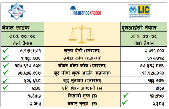 सर्वप्रथम नेपाल लाइफ र एलआईसी नेपाललाई तेश्रो त्रैमासको आधारमा दाँजेर हेरौ :