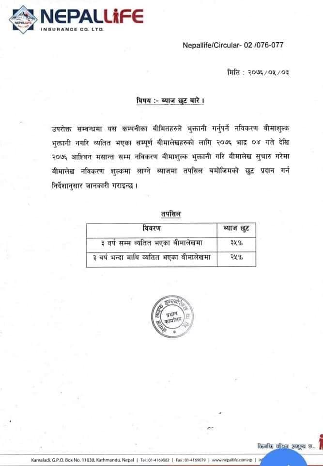 कम्पनीले जारी गरेको बीमालेख अन्तर्गत यही भदौ ४ गतेदेखि असोज मसान्तसम्म ब्यतित भएका बीमालेखहरु रकम भुक्तानी गरी सुचारु गरेमा बीमालेख नविकरण शूल्कमा लाग्ने व्याजमा छुट प्रदान गरिएको जनाएको छ ।