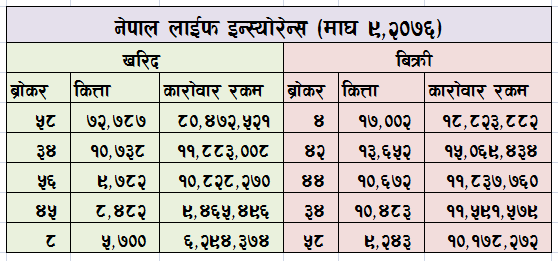 आज माघ ९ गतेको नेपाल लाइफको फ्लोरसिट हेर्दा ब्रोकर नम्बर ५८ बाट सर्वाधिक ८ करोड ४ लाख बराबरको शेयर खरिद बिक्री भएको छ भने ब्रोकर नम्बर ४ बाट सर्वाधिक १ करोड ८८ लाख बराबरको शेयर बिक्री भएको छ।