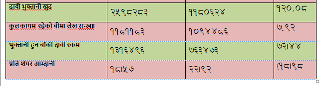 - यस त्रैमाससम्ममा कुल दावी भुक्त्तानी रकम ९५ दशमलव ४७ प्रतिशतले वृद्धि भएर २ अर्ब ३५ करोड रहेको छ भने खुद दावी भुक्त्तानी २ अर्ब ५९ करोड रहेको छ जुन अघिल्लो आर्थिक वर्ष भन्दा १२० दशमलव ०८ प्रतिशतले धेरै हो भने १ अर्ब ३१ करोड दावी भुक्तानी गर्न बाँकी छ ।