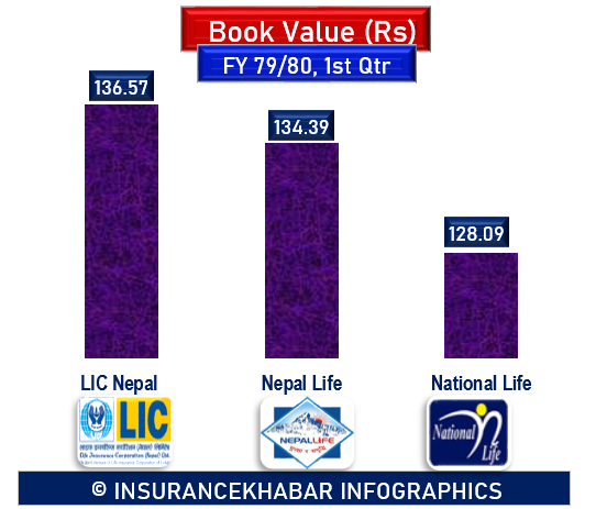 एलआईसी नेपालको किताबी मूल्य १३६ रुपैयाँ ५७ पैसा हुँदा नेपाल लाइफको १३४ रुपैयाँ ३९ पैसा र नेशनल लाईफको १२८ रुपैयाँ ०९ पैसा रहेको छ ।