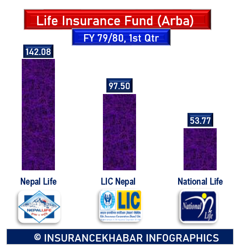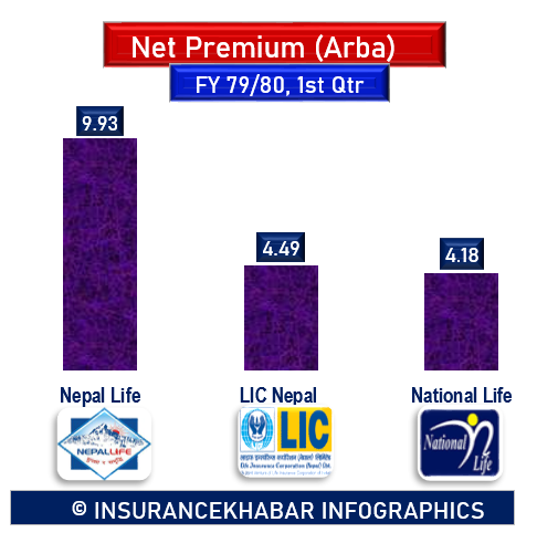 ३ महिनाको अवधिमा नेपाल लाईफले ९ अर्ब ९३ करोड कुल बीमा शुल्क आर्जन गरको छ लाईफ इन्स्योरेन्स कर्पोरेशन नेपालले ४ अर्ब ४९ करोड कुल बीमा शुल्क आर्जन गर्दा नेशनल लाईफ इन्स्योरेन्सले ४ अर्ब १८ करोड कुल बीमा शुल्क आर्जन गरेको छ ।