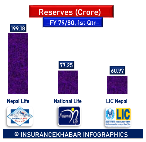 नेपाल लाईफको जगेडा कोषमा १ अर्ब ९९ करोड संचित छ भने नेशनल लाइफको जगेडा कोषमा ७७ करोड २५ लाख रुपैयाँ संचित छ र लाईफ इन्स्योरेन्स कर्पोरेशन नेपालको जगेडा कोषमा ६० करोड ९७ लाख रुपैँया संचित छ ।