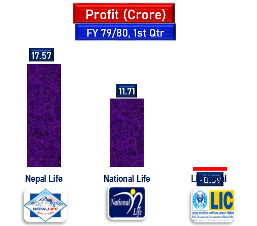 चालु आर्थिक वर्षको ३ महिनासम्मको अवधिमा नेपाल लाईफ १७ करोड ५७ लाख खुद नाफामा रहेको छ भने नेशनल लाईफ इन्स्योरेन्सले ११ करोड ७१ लाख खुद नाफा गरेको छ र लाईफ इन्स्योरेन्स कर्पोरेशन नेपाल ५९ लाख खुद नोक्सानीमा रहेको छ ।