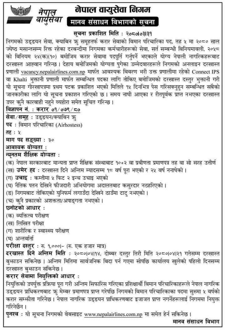 काठमाडौं । नेपाल वायुसेवा निगमले करार सेवाका लागि कर्मचारी माग गरेको छ । निगमले विमान परिचारिका पदका लागि तह पाँचमा ३० जना माग गरेको हो । उक्त पदमा आवेदन दिनका लागि मान्यता प्राप्त शैक्षिक संस्थाबाट प्लस टु उर्तिण गरेको हुनुपर्ने, उमेर १८ वर्ष पुरा भई २५ वर्ष ननाघेको हुनुपर्ने जनाएको छ । ईच्छुकले साउन १४ गतेसम्म आवेदन दिन सक्नेछन् भने दोब्बर दस्तुर तिरेर साउन २१ गतेसम्म आवेदन दिन सक्नेछन् ।
